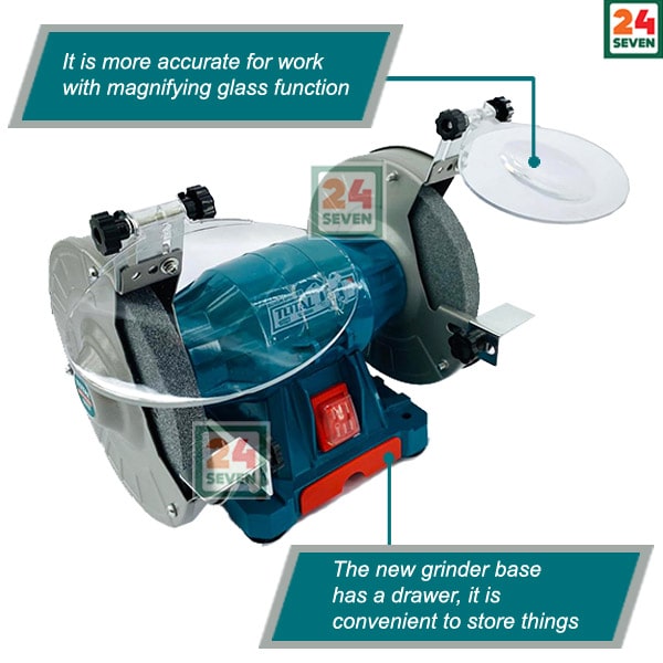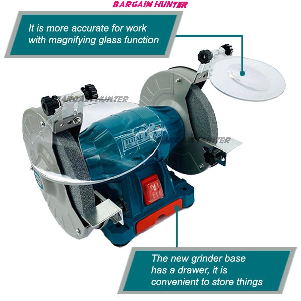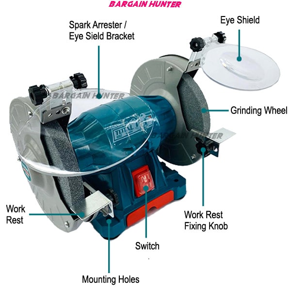 - You’ll find all kinds of uses for the TBG15015 Bench Grinder with Light in your home workshop or garage. Smooth roughened chisel edges, drill bits and knives. Grind down welded joints and rivets or polish surfaces. This grinder comes with medium and coarse wheels. Safety features of the TBG15015 6-inch Bench Grinder include eye shields and Dust proof switch for long life. Perfect for cleaning, sharpening, buffing, removing rust, or removing burs from metal