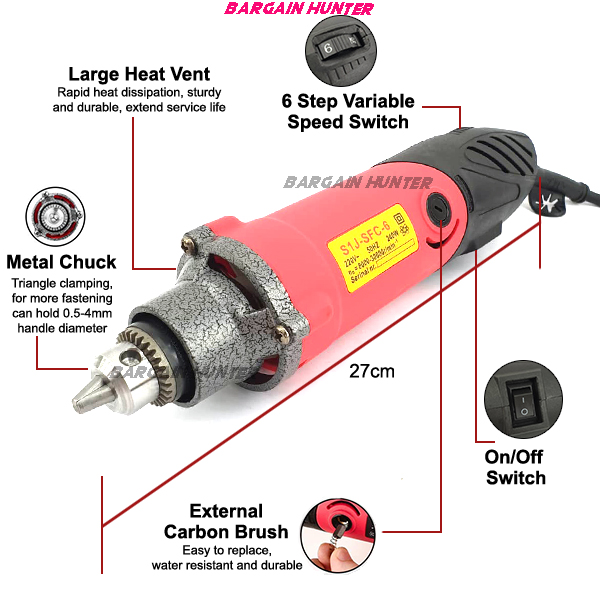 Variable Speed Drill : 6Step speed from 8000-30000 rpm allows you to adjust the speed for different purpose, low speed for cleaning applications and using brush accessories or high speed for routing, cutting and sanding for providing maximum control and precision. This mini grinder is an ideal for a wide variety of applications, such as cutting, engraving, trimming, polishing, refining, drilling or smoothing parts, for any work of improvement or manufacturing.